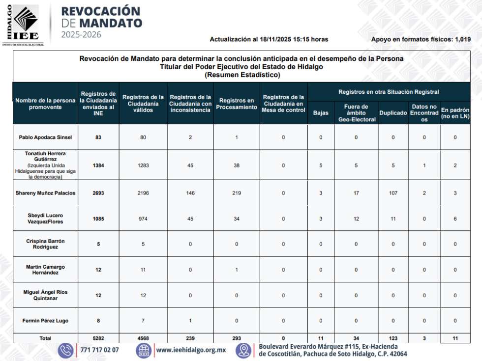 A 10 días de que termine el plazo para recaudar firmas del 10% del padrón en Hidalgo para hacer válida la solicitud de Revocación de mandato del gobernador Julio Menchaca, entre los registros válidos y aquellos que se encuentran en procesamiento se cuenta con menos del 2% de las requeridas, esto es, menos de 2 milésimas partes del padrón total de votantes en la entidad.