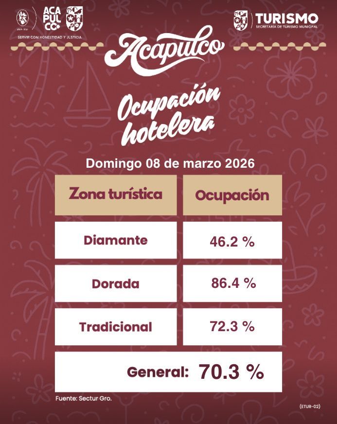 Este domingo, Acapulco reportó una ocupación hotelera general del 70.3 por ciento, con base en datos de la Secretaría de Turismo.