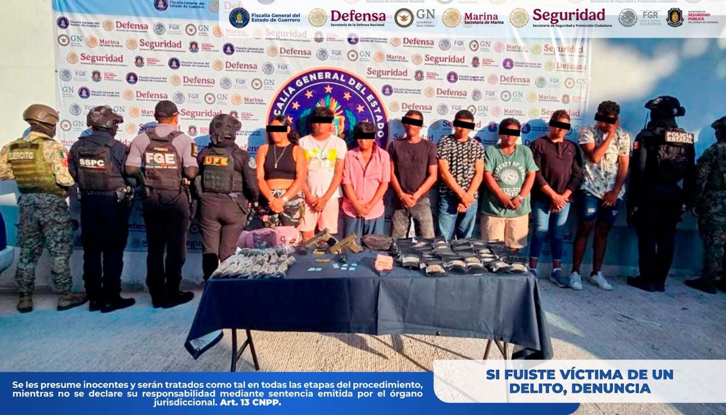 La Fiscalía General del Estado de Guerrero informa que personal de esta institución, en coordinación con DEFENSA, Guardia Nacional (GN), Secretaría de Marina (SEMAR), Secretaría de Seguridad y Protección Ciudadana (SSPC) y Policía Estatal (SSPGro), realizó la detención en flagrancia de Elías ’N’, Antonio ’N’, Alexis ’N’, Carlos ’N’, José Luis ’N’, José Antonio ’N’, José Eduardo ’N’ y Luz ’N’, derivado de recorridos de seguridad y vigilancia en el municipio de Acapulco de Juárez, Guerrero.