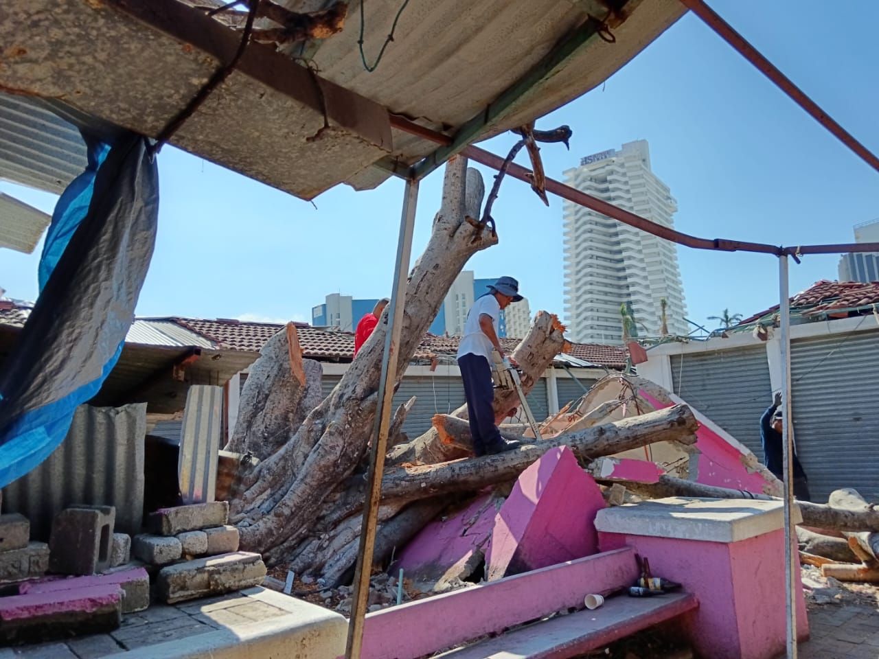 De acuerdo con el reporte del coordinador general de la dependencia, Efrén Valdez Ramírez, el personal operativo realizó la limpieza y retiro de escombros, así como el corte y seccionado de árboles y ramas caídas en el mercado de artesanías La Dalia, ubicado en la avenida Costera Miguel Alemán.