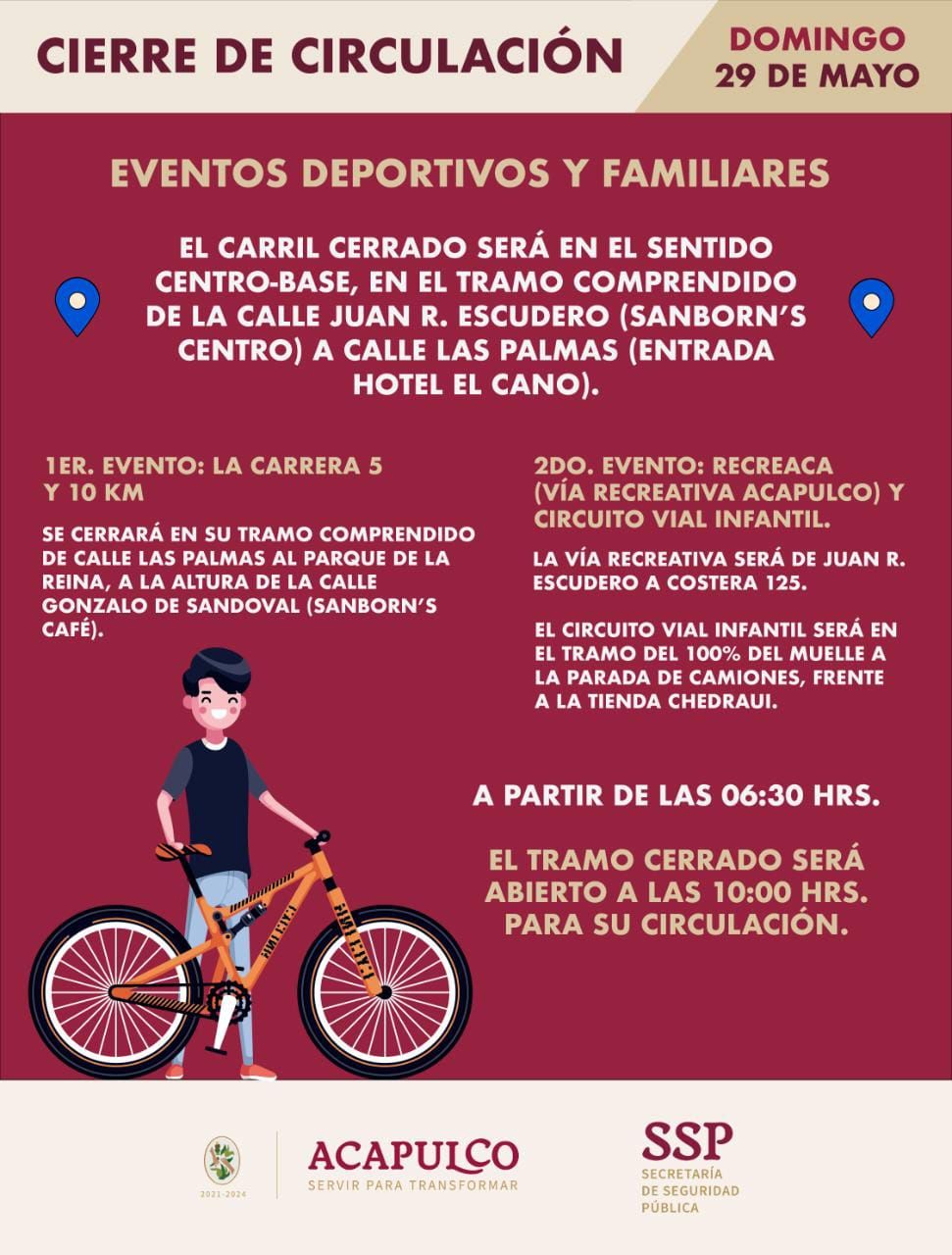 Ante los eventos deportivos y familiares que se llevarán a cabo mañana domingo en la avenida costera Miguel Alemán, la Secretaría de Seguridad Pública de Acapulco (SSP), a través de la Dirección de la Policía Vial, informa a la población que se cerrará un carril a partir de las 06:30 horas.