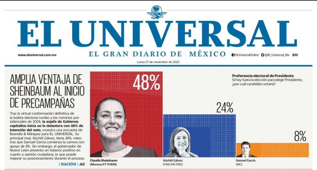 Estudio completo aquí: https://www.eluniversal.com.mx/elecciones/sheinbaum-con-24-puntos-de-ventaja-sobre-xochitl-samuel-empieza-la-carrera-con-8/