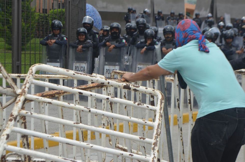 Cuando los maestros arreciaron sus intentos por derribar los cercos, los policías estatales antimotines lanzaron gas lacrimógeno y usaron también extintores para rociar a los maestros y dispersarlos.