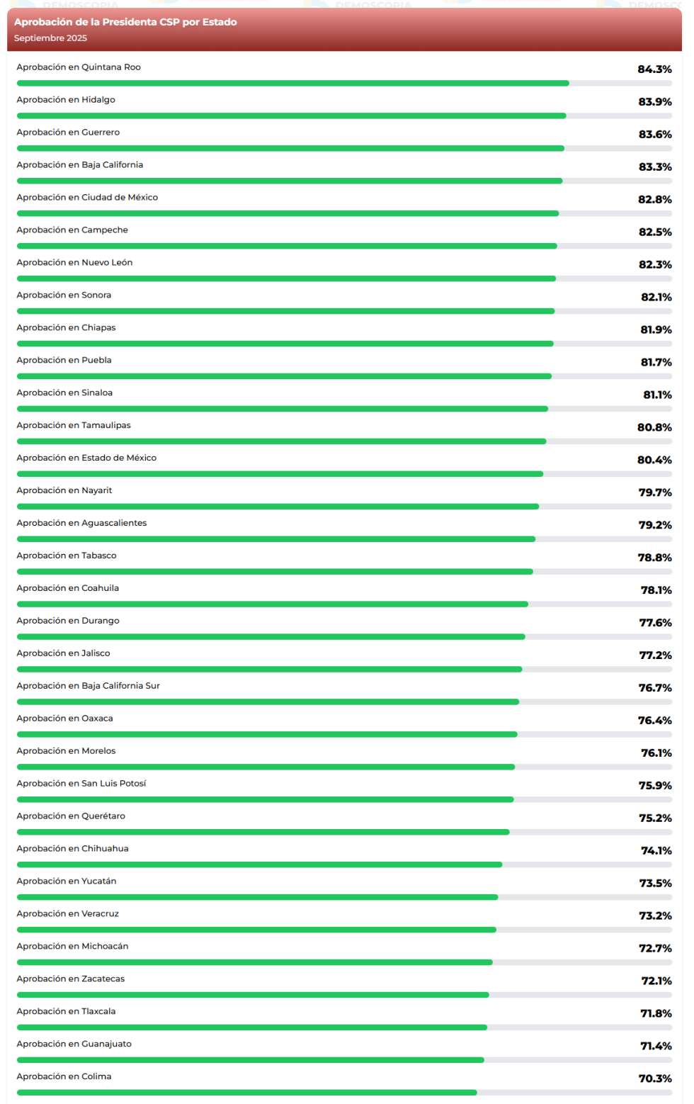 Los últimos lugares son Colima, Guanajuato y Tlaxcala, donde si bien están al final de la tabla, tienen una aprobación superior al 70% sobre la mandataria.