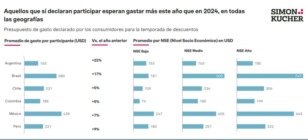 Los resultados indican que el gasto varía considerablemente según el nivel socioeconómico (NSE): los consumidores de NSE bajo planean gastar 185 dólares; los de NSE medio, 405 dólares; y los de NSE alto, 643 dólares. Además, al menos el 64% de los mexicanos manifestó su intención de participar en eventos de promociones de fin de año.