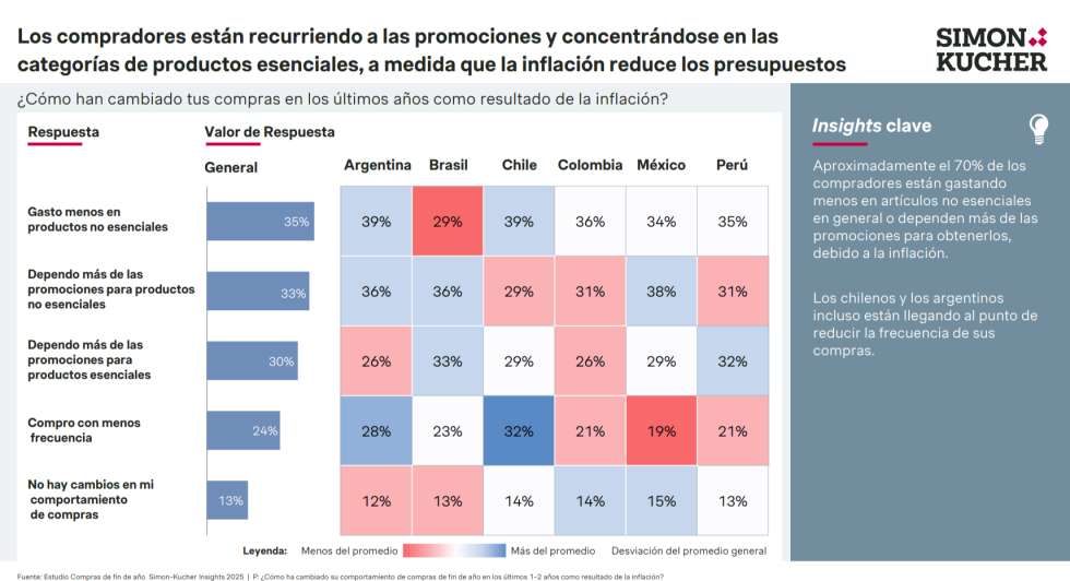 En este aspecto, Argentina sigue a México (28%), mientras que Brasil (40%), Perú (45%), Chile (54%) y Colombia (71%) presentan niveles más altos. Según el análisis, aproximadamente un tercio de los consumidores latinoamericanos depende más de ofertas para adquirir productos no esenciales debido a la inflación, aunque los mexicanos muestran una menor tendencia a recurrir a estas promociones.