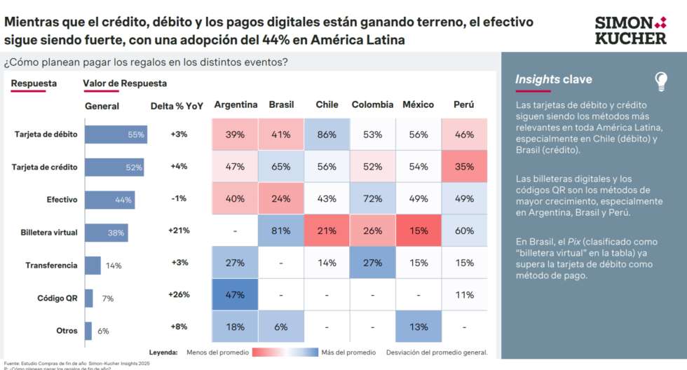 En Brasil, la billetera virtual Pix ya supera a la tarjeta de débito como método de pago. Aunque los pagos con tarjeta de crédito, débito y digitales ganan terreno, el efectivo sigue siendo relevante, con una adopción declarada del 44% en toda Latinoamérica.