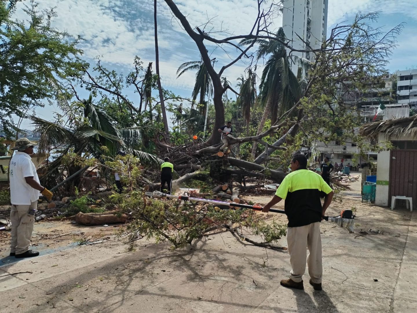 El coordinador, Efrén Valdéz Ramírez, informó que se mantienen los trabajos para despejar las áreas aledañas a playa Manzanillo. Una cuadrilla de 25 elementos con ayuda de motosierras, realiza el corte de cuatro árboles de gran tamaño que colapsaron por el paso del huracán ’Otis’.