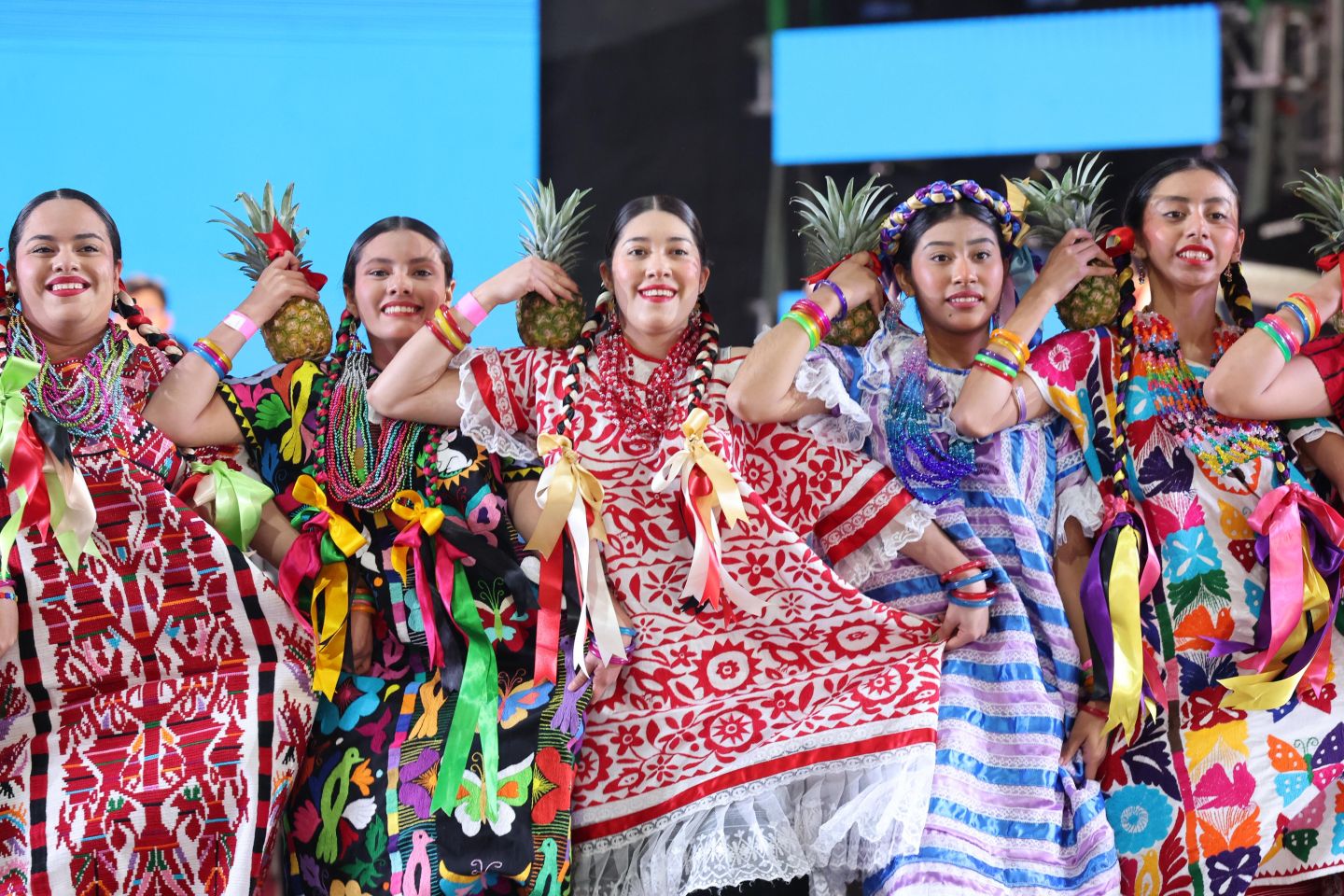 En cuanto a las delegaciones, en el escenario sorprendió la emblemática Flor de Piña, originaria de San Juan Bautista Tuxtepec, donde las danzantes portan dicha fruta como símbolo de fertilidad, prosperidad y abundancia en la región de la Cuenca del Papaloapan.