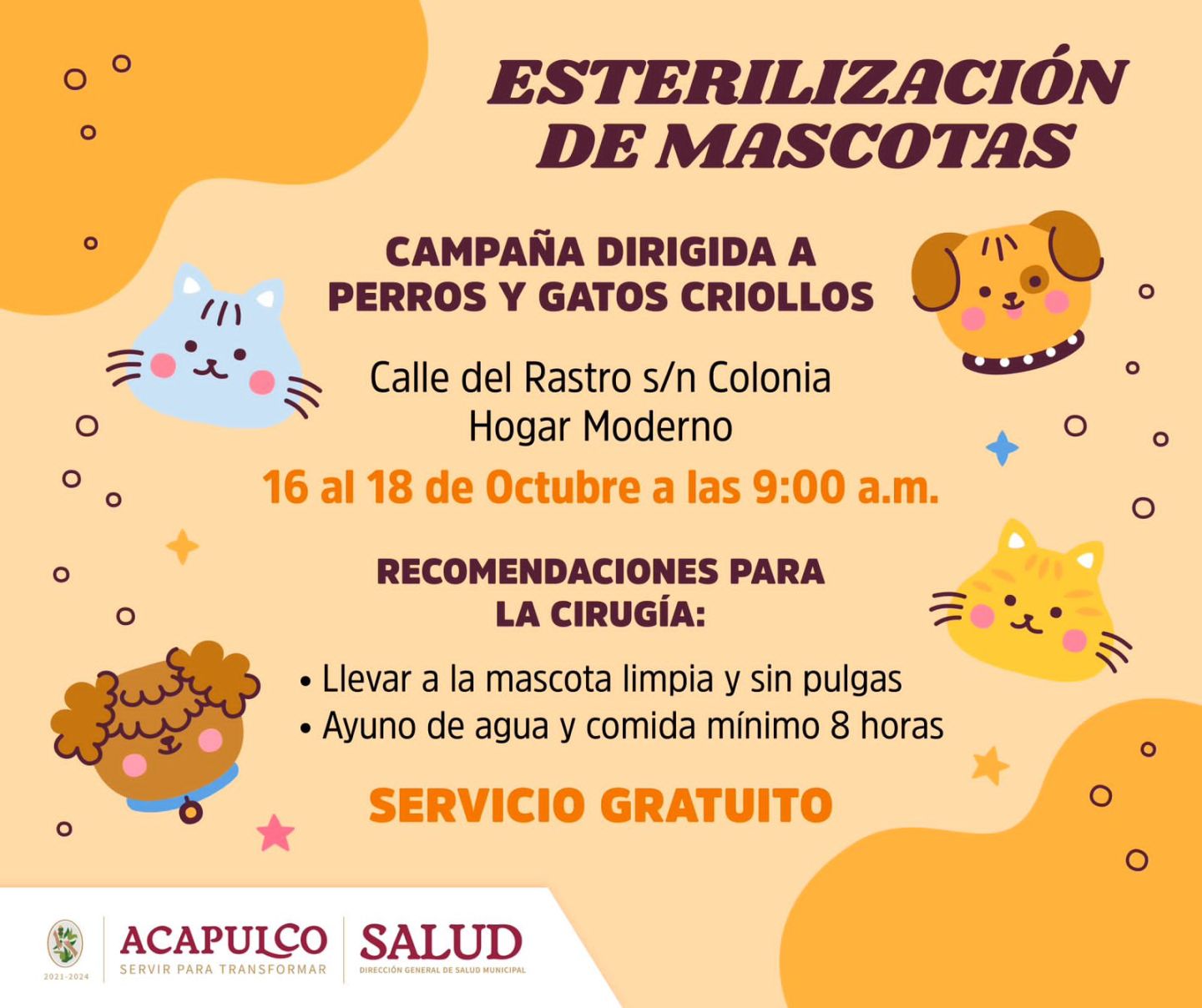 Esta campaña se mantendrá en Hogar Moderno hasta el 18 de octubre, en la calle del Rastro sin número, a un costado del mercado del mencionado núcleo poblacional, a partir de las 9:00 horas. La población deberá llevar a su mascota limpia y sin pulgas, con un ayuno de agua y comida de mínimo 8 horas.