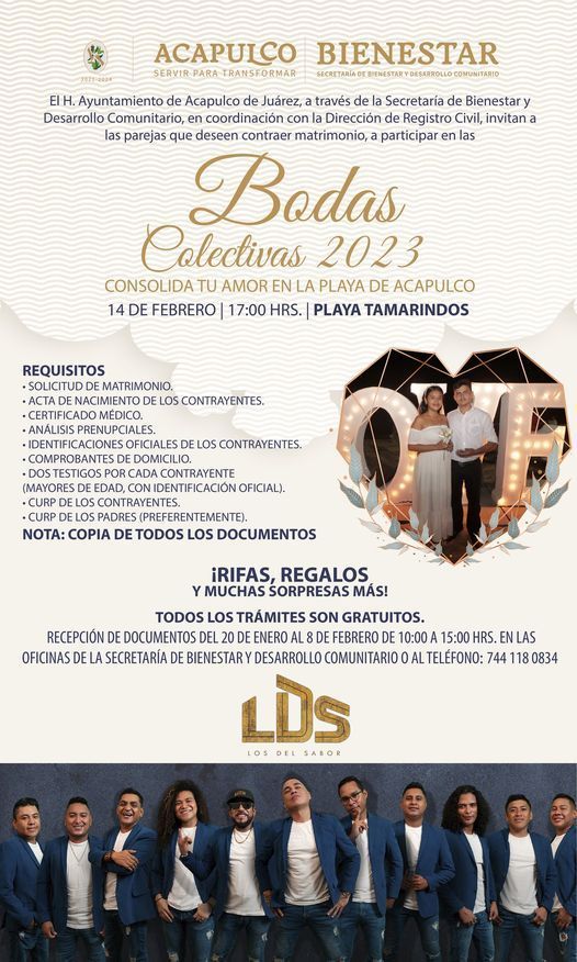 Con la finalidad de que las parejas acapulqueñas puedan legalizar su unión, el Gobierno Municipal que encabeza Abelina López Rodríguez, a través de la Secretaría de Desarrollo Social (SEDESOL), invita a la población para que forme parte de las ’Bodas Colectivas 2023’ a celebrarse el martes 14 de febrero.