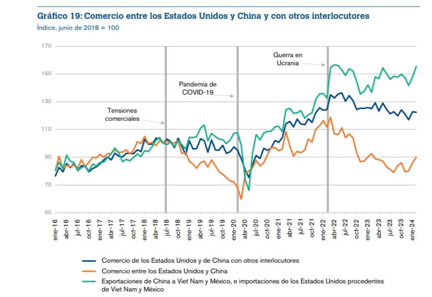 México y Viet Nam se han posicionado como economías de «enlace» —asumiendo el papel de fuente de muchos productos— en la reestructuración de las cadenas de suministro mundiales que abastecen al mercado estadounidense (Alfaro y Chor, 2023). Esta situación se ilustra en el gráfico 18, en el que México y Vietnam están separados del resto del mundo.