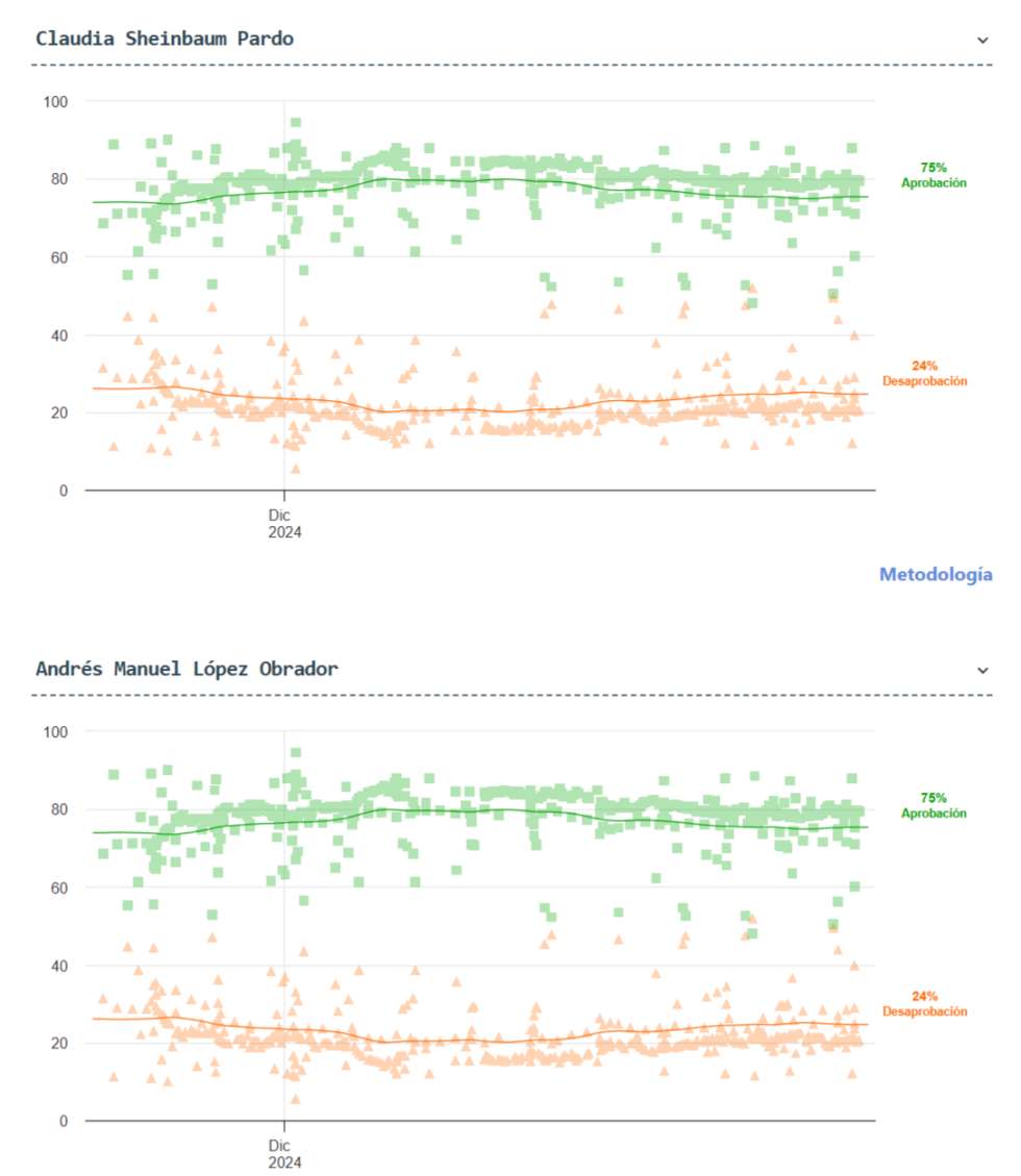 Según la agregadora de encuestas Polls, Sheinbaum disfruta de un respaldo del 75% de la población, superando los niveles de aprobación que obtuvo Andrés Manuel López Obrador en su primer año, a pesar de que su predecesor contaba con una mayoría legislativa más limitada. Además, actualmente se posiciona como la cuarta mujer más poderosa del mundo, según una encuesta de QM Estudios de Opinión publicada el 23 de diciembre.