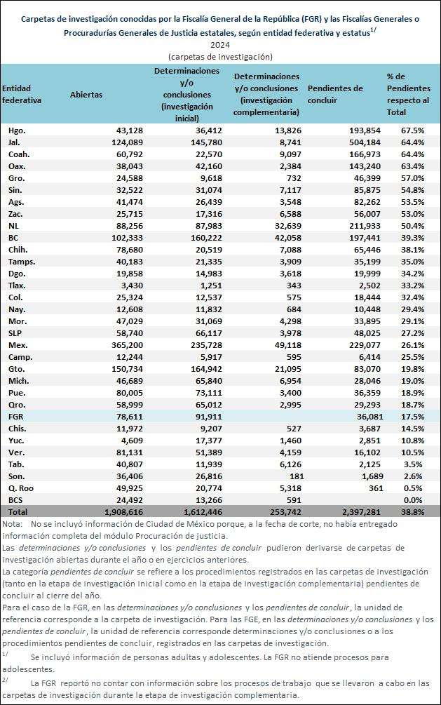En ese tenor, Hidalgo se encuentra prácticamente 30 puntos porcentuales por encima de la media nacional, la cual es del 38.8% de pendientes de concluir respecto al total de Carpetas iniciadas.