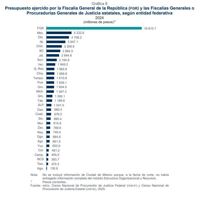 Por último, la PGJEH se contempla como la peor del país porque no existiría una verdadera voluntad para cambiar su realidad, esto es, que no sólo es la que más podría tardar para convertirse en Fiscalía, sino que es la que menores recursos le fueron presupuestados pese a su rezago.